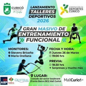 La Corporación de Deportes de Curicó, en conjunto con la Ilustre Municipalidad de Curicó, realizará el lanzamiento oficial de los Talleres Deportivos 2026 a través de un gran masivo de entrenamiento funcional abierto a toda la comunidad.
