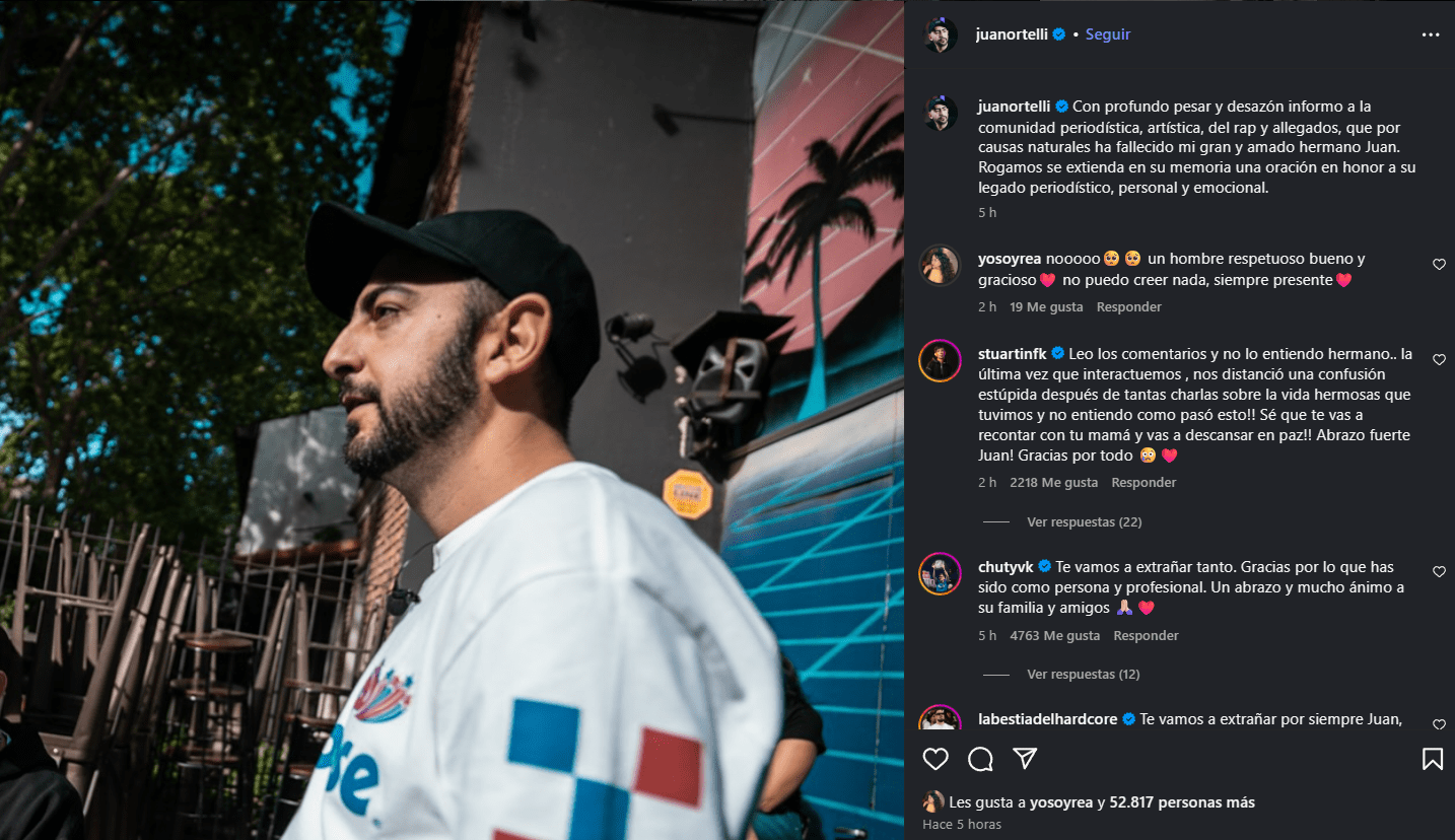 Este lunes se conoció la triste noticia del fallecimiento de Juan Ortelli, periodista musical, exdirector de Rolling Stone Argentina (2013–2018) y una figura clave en la difusión del freestyle y el rap en el país. Tenía 43 años, y, según informó su familia desde su cuenta oficial de Instagram, falleció por causas naturales.