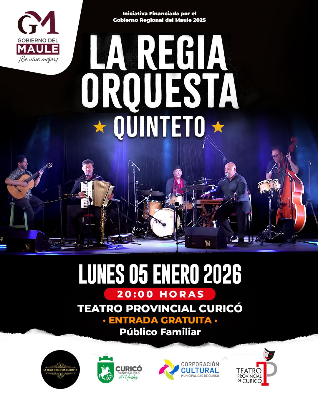 La Municipalidad de Curicó a través de la Corporación Cultural y Teatro Provincial traen a la agrupación nacional “Regia Orquesta Quinteto”, grupo nacional que trae la música del recuerdo y música de la obra de teatro “La Negra Ester”.