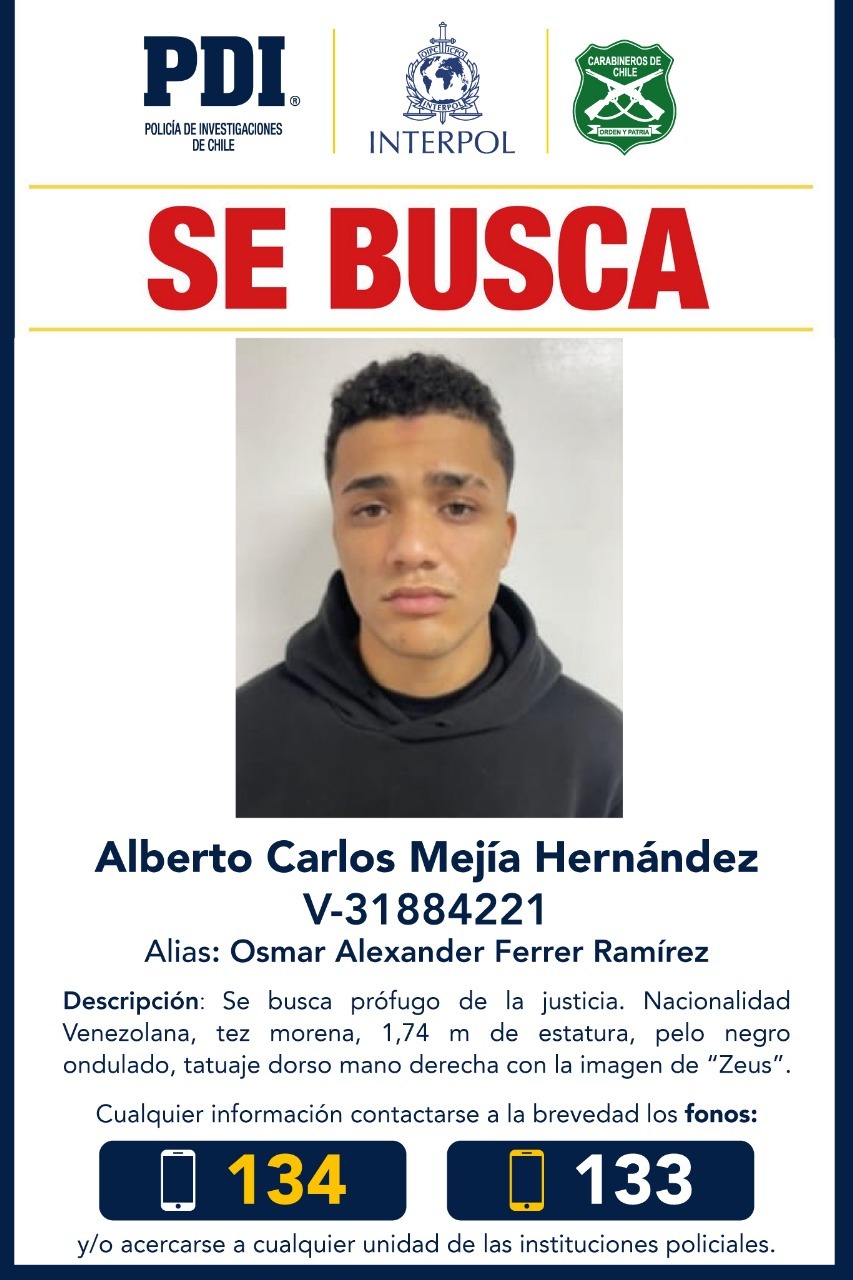 El ciudadano venezolano Alberto Carlos Mejía Hernández, imputado por el homicidio de José Reyes Ossa —conocido como el “Rey de Meiggs”—, logró salir de Chile tras su liberación, ocurrida hace poco más de una semana. Así lo confirmaron este domingo fuentes vinculadas a la investigación, que indicaron que el individuo cruzó la frontera hacia Perú por un paso no habilitado, tras ser visto por última vez el 12 de julio en el Terminal Rodoviario de Arica.